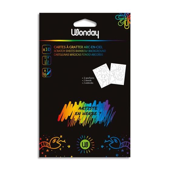 Pochette de 10 cartes à gratter arc-en-ciel, format 114 x 153 mm, incluant 2 pochoirs et 1 stylet en bambou.